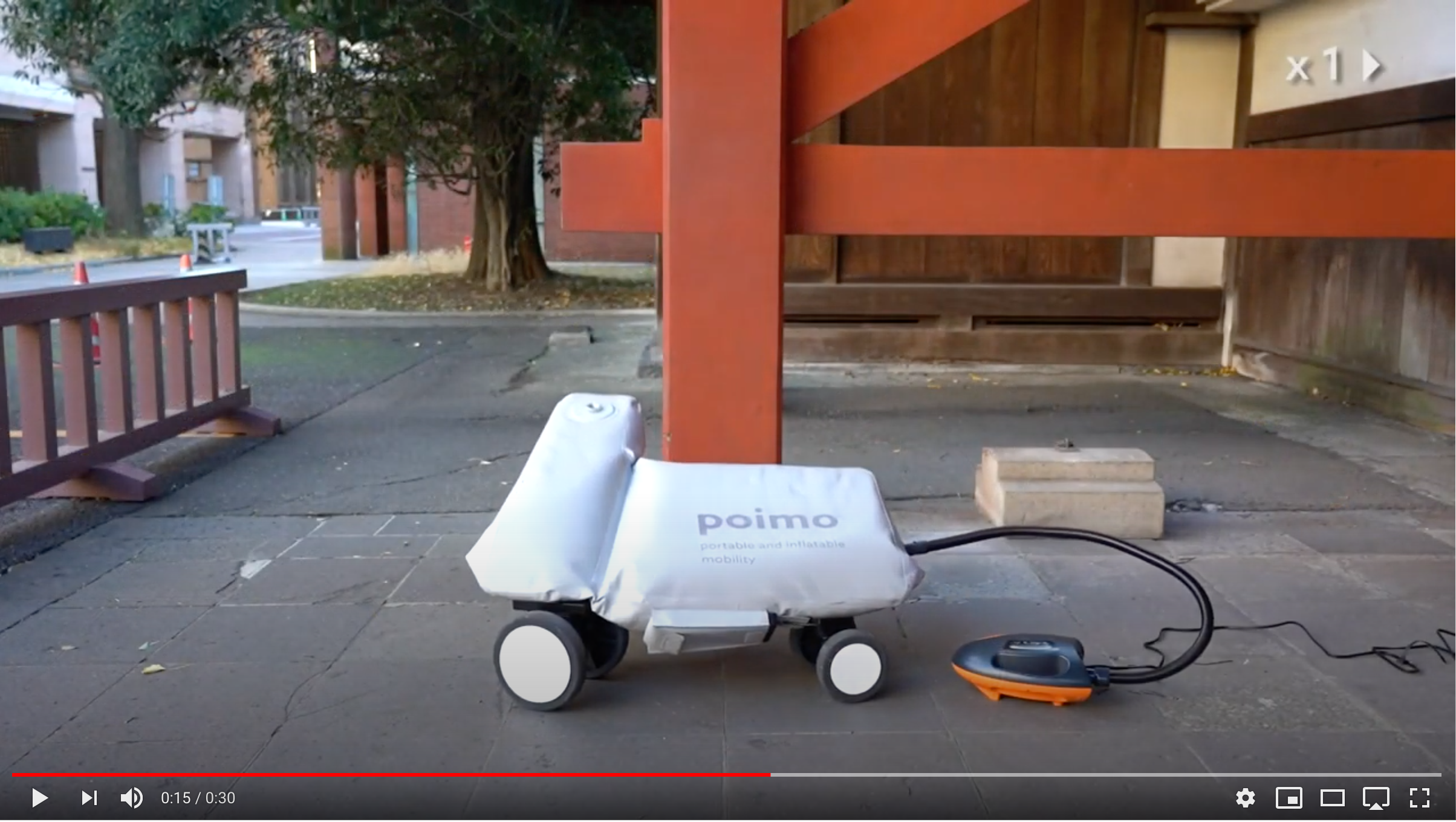 Indbygget airbag? I den endnu mere(!) bizzarre afdeling finder vi Poimo, en elscooter-knallert-ting, der kan klemmes helt sammen og bæres i en rygsæk. Den er nemlig oppustelig!