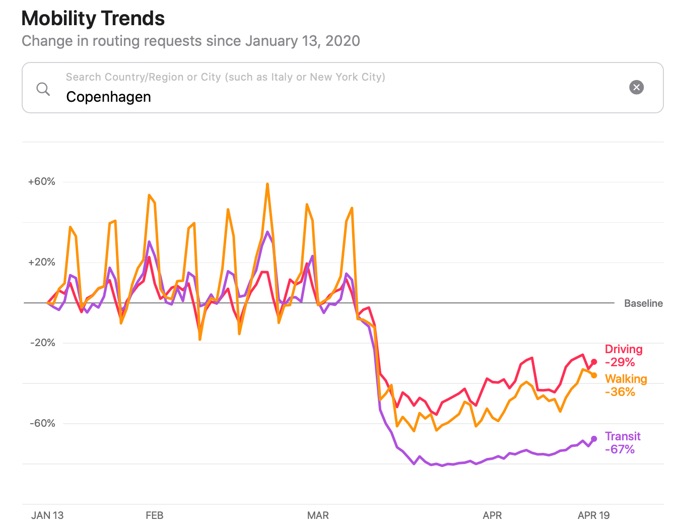 Også Apple og Google har stillet værktøjer til rådighed, som giver et indblik i, hvordan vores bevægelsesmønstre har ændret sig.